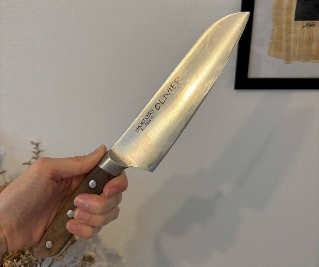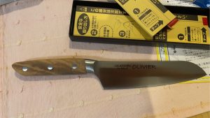 木の柄の包丁が欲しくて、2年ほど前に購入した三徳包丁です。