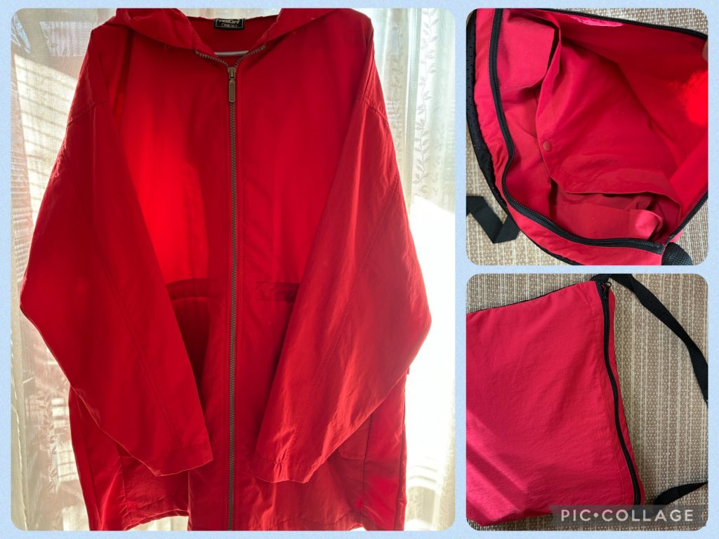 畳んで収納できるアウターは見たことありますが、バッグ型にして身体にかけておけるのは初かと。